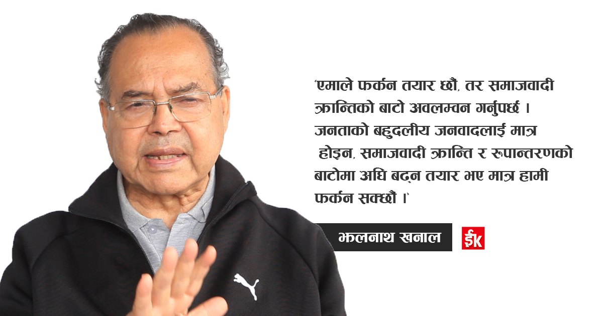 नेपालको वाम आन्दोलन फेरि एकपटक वैचारिक मोडमा उभिएको छ । नेकपा (एकीकृत समाजवादी)का सम्मानित नेता झलनाथ खनालले एमालेमा फर्कने सम्भावनालाई जोड दिँदै समाजवादी क्रान्तिको बाटो अपनाउनुपर्ने शर्त राख्नुभएको छ ।
