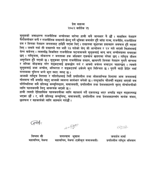 उनीहरुले संयुक्त विज्ञप्ति निकालेर वृहत वामपन्थी एकताका लागि आह्वान समेत गर्ने भएका छन् ।