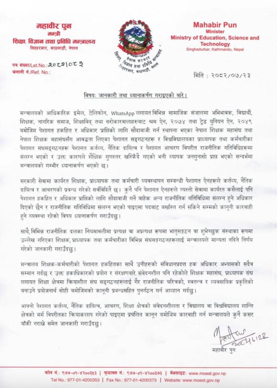‘राजनीतिक गतिविधिमा संलग्न भएको पाइएमा पदबाट बर्खास्त गर्न सकिने सम्मको कानूनी कारबाही हुने व्यवस्था रहेको विषय ध्यानाकर्षण गराउँदछौं जारी सूचनामा भनिएकाे छ। दलका भ्रातृ तथा शुभेच्छुक संगठनको रूपमा बनाइएका शिक्षक, प्राध्यापक तथा कर्मचारीका विभिन्न संघ-संगठनहरूलाई मन्त्रालयले मान्यता नदिने निर्णय गरेको समेत उहाँले जानकारी गराउनुभयाे।