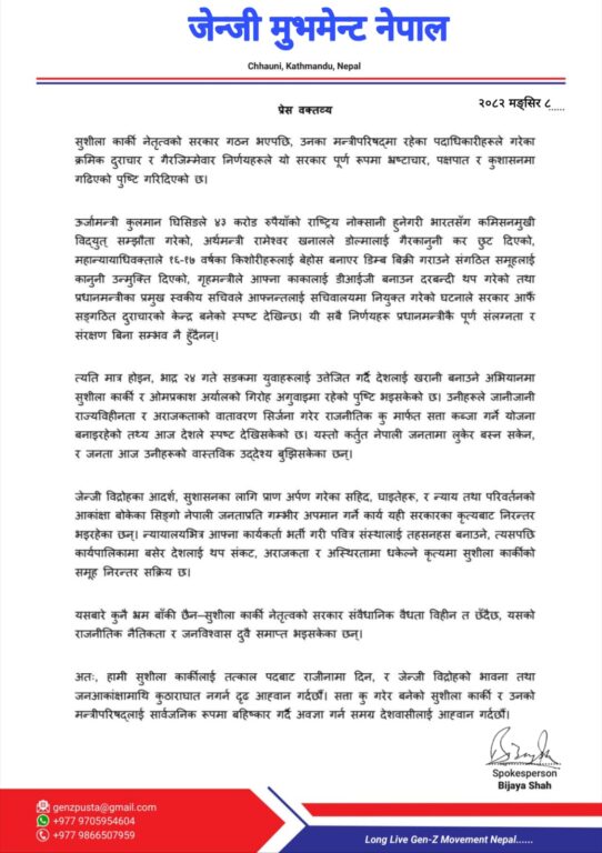 प्रधानमन्त्री सुशीला कार्कीले तत्काल पदबाट राजीनामा दिनुपर्छ,’ विज्ञप्तिमा भनिएको छ, सत्ता दुरुपयोग गरेर बनेको कार्की नेतृत्वको मन्त्रिपरिषदलाई सार्वजनिक रूपमा बहिष्कार गर्दै अवज्ञा गर्न हामी देशभरका नागरिकलाई आह्वान गर्दछौँ।’