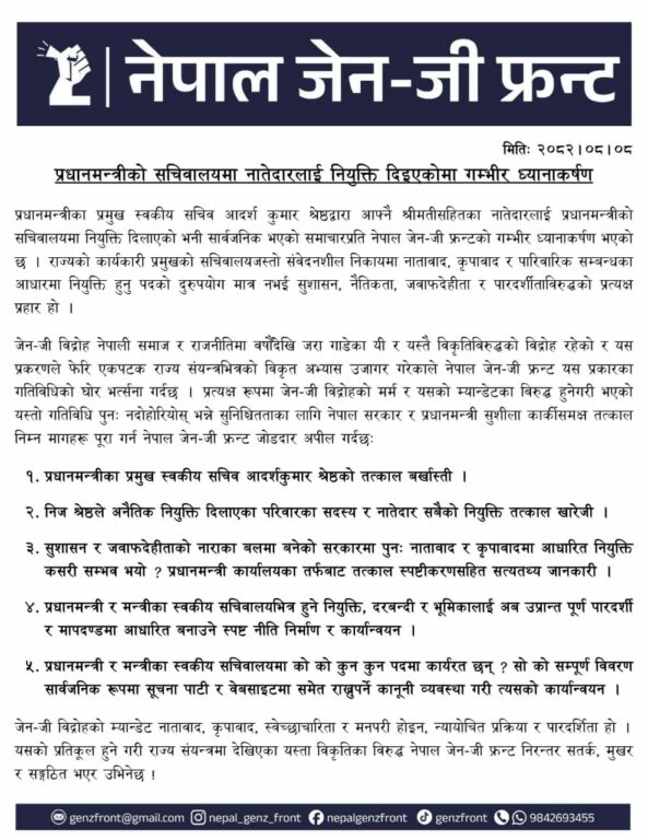 प्रधानमन्त्रीका प्रमुख स्वकिय सचिव पदमुक्त गर्न जेनजी फ्रन्टको माग