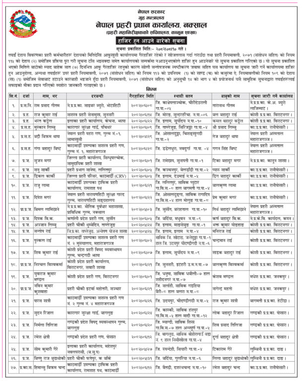 दुई जना बाहेक सबै जेनजी आन्दोलनपछि सम्पर्कविहीन रहेको विवरणमा उल्लेख छ। नाम, ठेगाना र गैरहाजिर भएको मिति सहित सार्वजनिक सूचना जारी गर्दै प्ररामले तोकिएको म्यादभित्र हाजिर भई सन्तोषजनक स्पष्टीकरण दिन आग्रह गरेको छ। अन्यथा कानुनअनुसार कारबाही गरिने चेतावनी दिइएको छ।