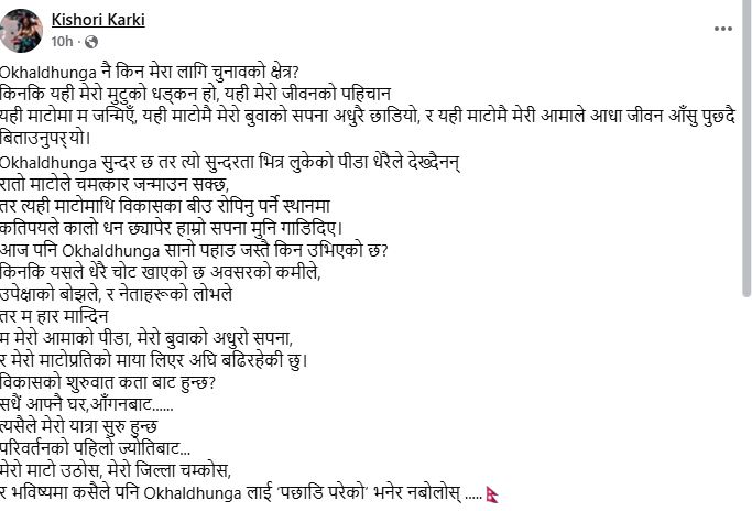 उनले ओखलढुंगा मुटुको धड्कन, जीवनको पहिचान भएको बताउँदै लेखेकी छन्,’यही माटोमा म जन्मिएँ, यही माटोमै मेरो बुवाको सपना अधुरै छाडियो र यही माटोमै मेरी आमाले आधा जीवन आँसु पुछ्दै बिताउनु परेकाे बताएकी छन् ।