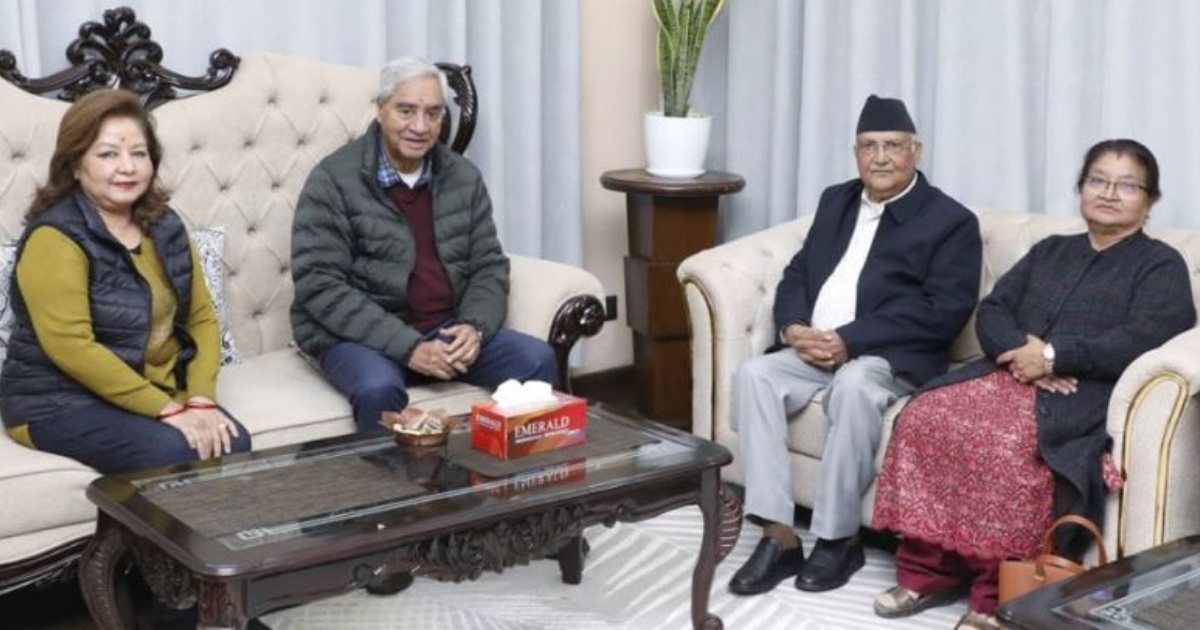 अध्यक्ष ओली पत्नी राधिका शाक्यसहित सभापति देउवाको अस्थायी निवास महाराजगञ्जमा उहाँलाई भेट्न शुक्रबार पुग्नुभएकाे हाे। ओली र देउवाको भेटमा पूर्वपरराष्ट्रमन्त्री एवं देउवा पत्नी आरजु राणा देउवा पनि सहभागी हुनुभएकाे थियाे। ओलीको सचिवालयले देउवा ओलीको भेटमा आरजु र राधिका पनि सँगै रहेको तस्बिर सार्वजनिक गरेको छ।