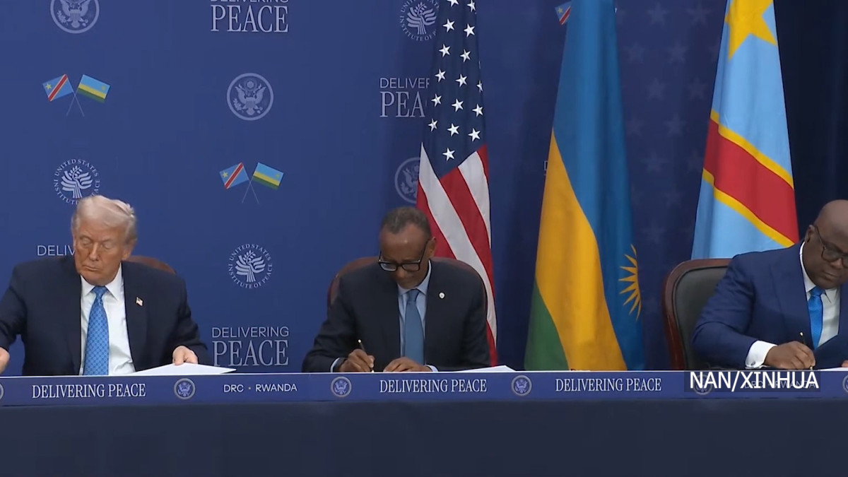 डिआरसीका राष्ट्रपति फेलिक्स त्शिसेकेदी र रुवाण्डाका पल कागामेले अमेरिकी शान्ति संस्थानमा आयोजित एक समारोहमा सम्झौतामा हस्ताक्षर गर्नुभयो ।