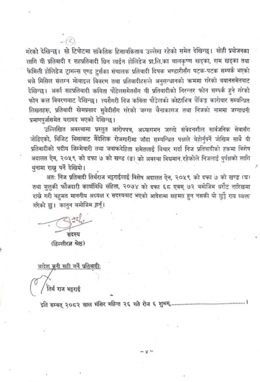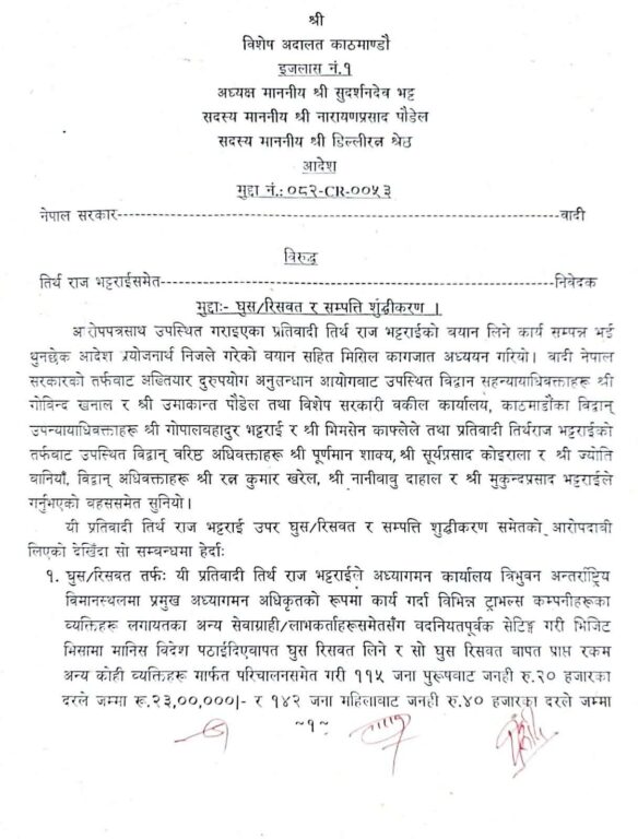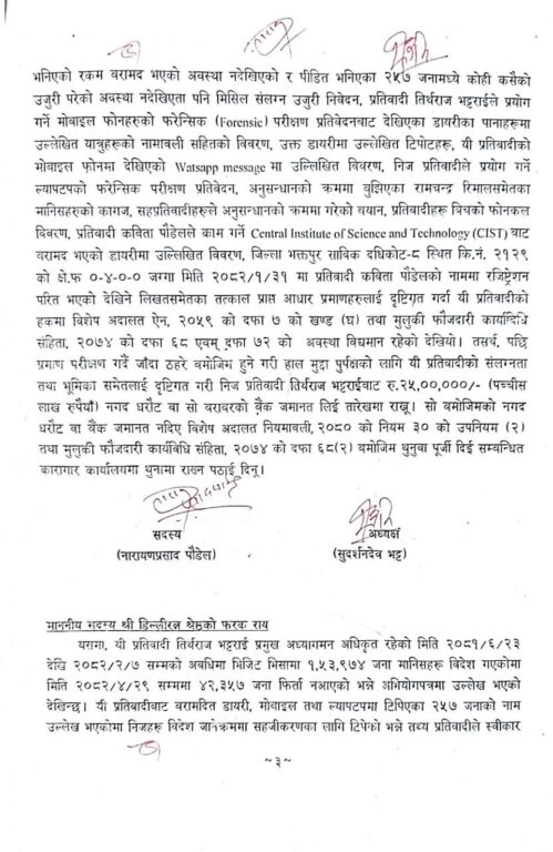 विशेष अदालतका अध्यक्ष सुदर्शनदेव भट्ट र सदस्य नारायणप्रसाद पौडेलको इजलासले धरौटीमा रिहाई आदेश दिएको छ भने सदस्य डिल्लीराज श्रेष्ठले पुर्पक्षका लागि थुनामा राख्नुपर्ने भन्दै फरक राय प्रस्तुत गरेका छन्।