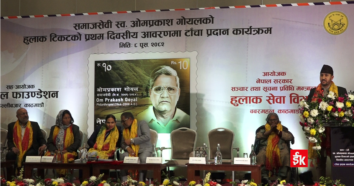 काठमाडाैं । हुलाक सेवा विभागले समाजसेवी स्वर्गीय ओमप्रकाश गोयलको नाममा रुपैयाँ १० को नयाँ हुलाक टिकट सार्वजनिक गरेको छ ।