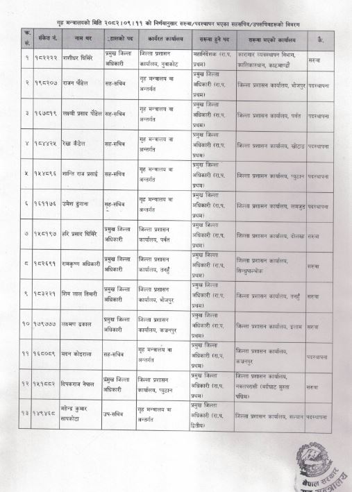 गृहमन्त्री ओमप्रकाश अर्यालले शुक्रबार मन्त्रीस्तरीय निर्णय गर्दै उनीहरुको सरुवा गर्नुभएकाे हाे। मन्त्रालयले केही दिन अघि विभिन्न मन्त्रालयबाट सरुवा भएर गृह मन्त्रालय भित्रिएका ७ जना सहसचिवमध्ये ६ जनालाई विभिन्न जिल्लाको प्रमुख जिल्ला अधिकारीको जिम्मेवारी दिएको छ।