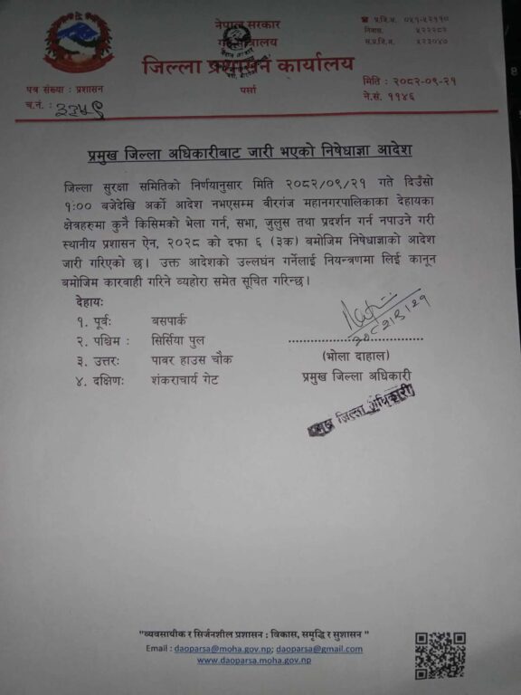 पर्साको वीरगञ्ज महानगरपालिकामा निषेधाज्ञा आदेश जारी भएको छ। सोमबार दिउँसो १ बजेदेखि अर्को आदेश नभएसम्म वीरगञ्ज महानगर क्षेत्रमा निषेधाज्ञा आदेश जारी गरेको हो।