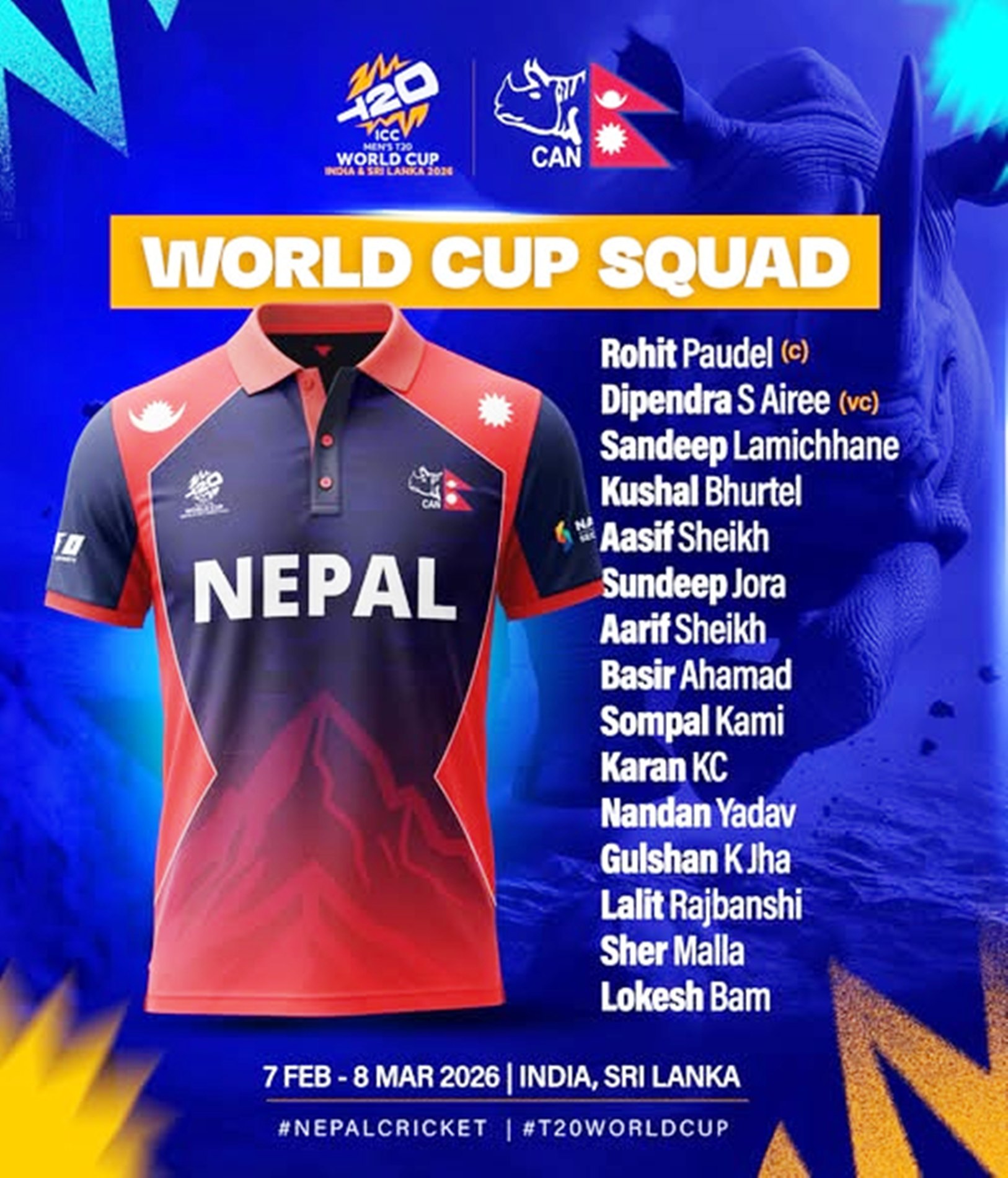 काठमाडौं । भारत र श्रीलंकामा संयुक्त रूपमा आयोजना हुने आईसीसी टी–२० विश्वकप २०२६ का लागि नेपालको १५ सदस्यीय टोली घोषणा भएको छ ।