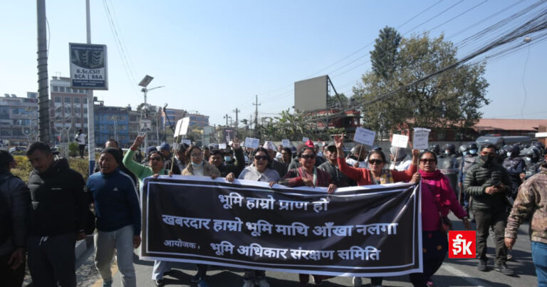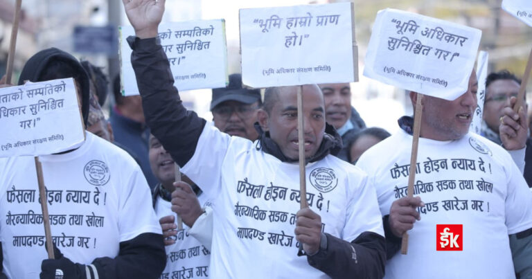 गैरन्यायिक खोला तथा सडक मापदण्ड पीडित संघर्ष समितिले मुद्दालाई अग्राधिकार दिएर छिटो निर्णय गर्न माग गर्दै बिहीवार काठमाडौंको माईतीघरमा विरोध प्रदर्शन गरेको हो ।