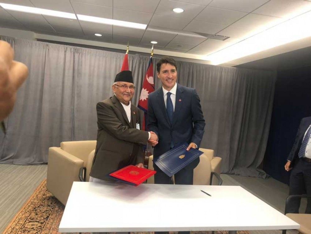 New York, Sept 25 (RSS): Prime Minister KP Sharma Oli and his Canadian counterpart Justin Trudeau have signed an agreement on establishing a bilateral consultation mechanism between Nepal and Canada.