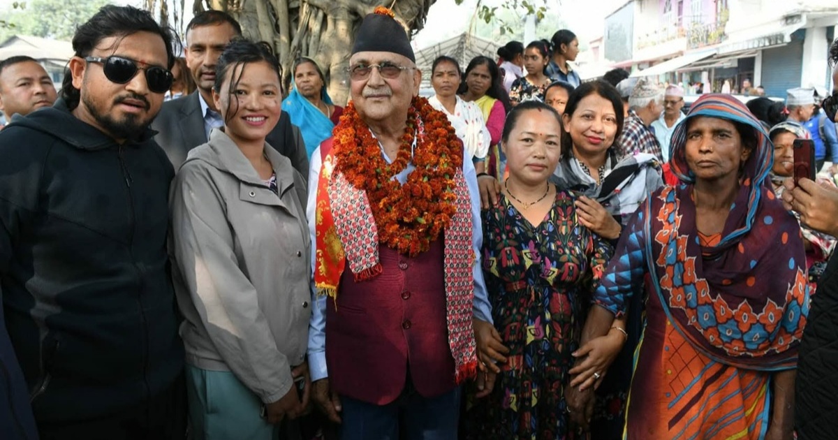 अध्यक्ष ओलीले मंगलबार पश्चिम गौरादहका बालबथानदेखि स्कूलचौनसम्मका १० स्थानमा मतदातासँग भेटघाट गर्नुभएकाे थियाे ।