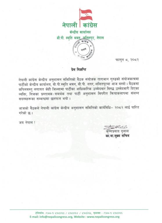 काठमाडौं । नेपाली कांग्रेसले केन्द्रीय अनुशासन समितिको कार्यविधि २०८२ लाई पारित गरेको छ ।