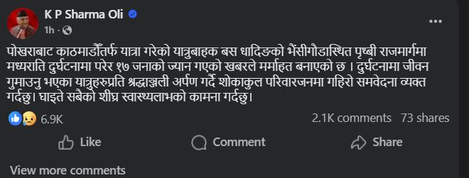 अध्यक्ष ओलीले साेमबार सामाजिक सञ्जालमार्फत घटनाका मृतकहरूप्रति श्रद्धाञ्जली दिँदै उनीहरूका परिवारमा समवेदना व्यक्त गर्नुभउकाे हाे । उहाँले दुर्घटनाका घाइतेको शीघ्र स्वास्थ्य लाभको कामना समेत गर्नुभएकाे छ। पोखराबाट काठमाडाैं आउँदै गरेको ग १ ख १४२१ नम्बर यात्रुबाहक बस आइतबार रातीिधादिङको भैंसीगौंडा स्थित पृथ्वी राजमार्गमा दुर्घटना हुँदा हालसम्म १७ जनाको मृत्यु भएको छ । साेही दुर्घटनामा परी २४ जना यात्रु घाइते भएकाे प्रहरीले बताएकाे हाे ।