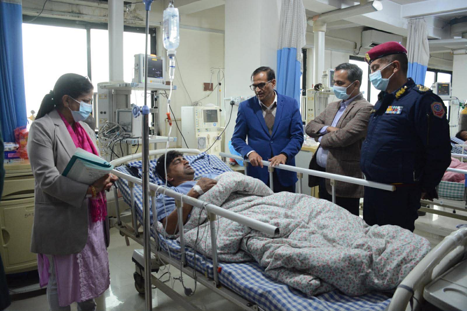 गृहमन्त्रीका साथमा गृहसचिव मन्त्रालयका उच्च अधिकारी, स्वास्थ्य मन्त्रालयका अधिकारी, सुरक्षा निकायका प्रमुखलगायत अस्पताल पुग्नुभएको थियो ।