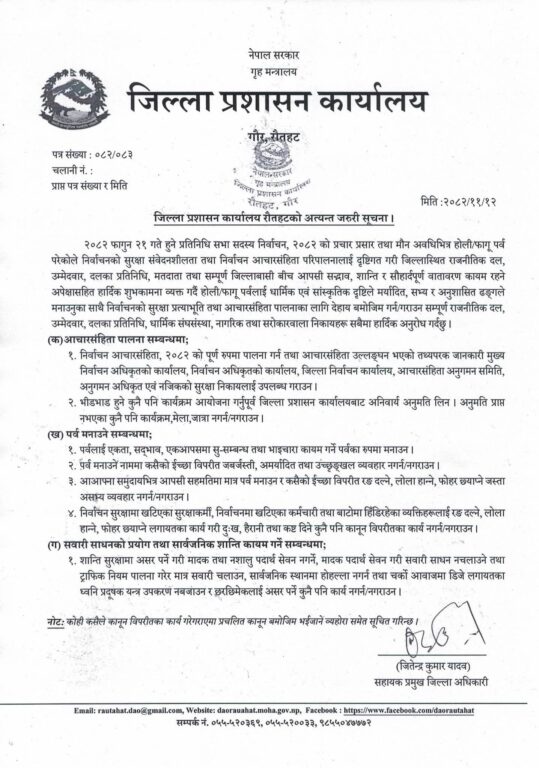 जसका कारण आचारसंहिता कडाइका साथ पालना गर्न जिल्ला प्रशासन कार्यालय रौतहटले आग्रह गरेको हाे। सहायक सिडिओ जितेन्द्र कुमार यादवले मंगलबार एक सूचना जारी गर्दै प्रशासनको आग्रह विपरीत गतिविधि गर्ने जो कोहीलाई पनि कडा कारबाही गर्ने चेतावनी दिनुभएकाे छ । यहि फागुन २१ गते हुने प्रतिनिधिसभा सदस्य निर्वाचन र होली पर्व एकै समय परेकाले रौतहटमा सुरक्षा संवेदनशीलता बढेको भन्दै प्रशासनले विशेष सूचना जारी गरेको हाे।