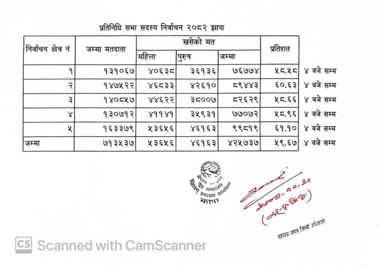 अपरान्ह ४ बजेसम्म क्षेत्र नम्बर १ मा ५८.४५ प्रतिशत, क्षेत्र नम्बर २ मा ६०.६३ प्रतिशत, क्षेत्र नम्बर ३ मा ५६.६६ प्रतिशत, क्षेत्र नम्बर ४ मा ५६.९६ प्रतिशत र क्षेत्र नम्बर ५ मा ६१.१० प्रतिशत मतदान भएको छ ।