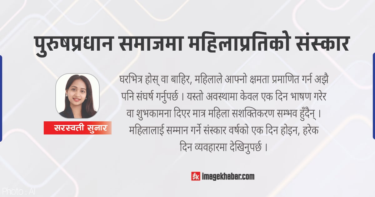 समाज परिवर्तन केवल कानुन बनाएर मात्र सम्भव हुँदैन, सोच परिवर्तन हुन आवश्यक छ । परिवार, विद्यालय र समाजले महिलालाई सम्मान गर्ने संस्कार सिकाउनुपर्छ । छोरी र छोरालाई बराबरी अवसर दिनुपर्छ । जब बच्चादेखि नै समानताको शिक्षा दिइन्छ, तब भविष्यमा समाज पनि समानतामूलक बन्छ । महिलाको सशक्तिकरण केवल महिलाको विषय मात्र होइन, यो देशको समग्र विकाससँग जोडिएको विषय हो । त्यसैले महिलालाई शिक्षा, रोजगारी, नेतृत्व र निर्णय प्रक्रियामा बराबरी सहभागिता दिनु आवश्यक छ । महिलालाई शंका गर्ने होइन, विश्वास गर्ने संस्कार विकास गर्नुपर्छ ।