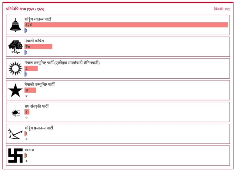 हालसम्म रास्वपाले सर्वाधिक १ सय २४ सिट जितिसकेको छ । दोस्रो स्थानमा रहेको कांग्रेसले १७ र तेस्राे स्थानमा रहेकाे एमालेले ८ सिट जितेको हुन् । नेपाली कम्युनिस्ट फार्टी ७ सिटसहति चौथो स्थानमा रहेकाे छ ।