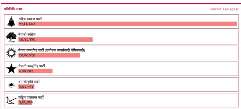 त्यसैगरी, नेपाली कम्युनिष्ट पार्टी (नेकपा)ले ८ लाख ४ हजार १ सय ७१ , श्रम संस्कृतिले ३ लाख ७८ हजार ५ सस ९४ मत पाउँदा राप्रपाले ३ लाख २९ हजार ४ सय ६६ मत प्राप्त गरेकाे हाे । यी ६ वटा राजनीतिक दलहरुले अहिलेसम्म समानुपातिकको थ्रेसहोल्ड कटाएका छन् । समानुपातिकमा मत पाउने अरु ५१ वटा दल रहे पनि उनीहरुले थ्रेसहोल्ड पार गर्ने सम्भावना छैन । साेही दलहरुले प्राप्त गरेको मत करिब ८ लाख रहेको छ ।