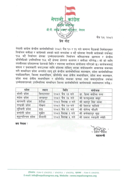 महामन्त्री प्रदीप पौडेलले विज्ञप्ति जारी गर्दै केन्द्रीय कार्यसमितिको निर्णयअनुसार कार्यक्रम सञ्चालन गर्न लागिएको जानकारी दिएका छन्।