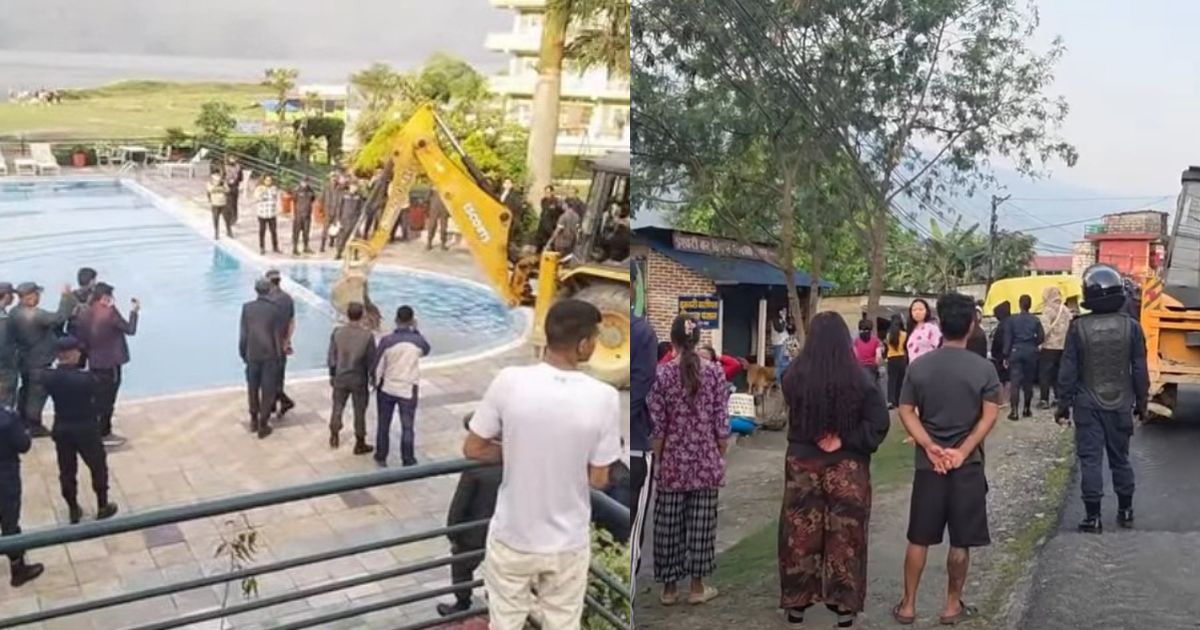 पोखरा । फेवातालको मापदण्ड मिचेर निर्माण गरिएका अवैध संरचना हटाउने क्रममा पोखराको ‘वाटर फ्रन्ट रिसोर्ट’मा डोजर चलाइएको छ।