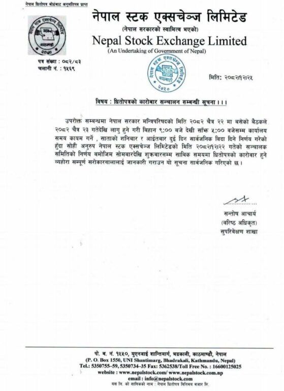 नेप्सेले बुधबार एक सूचना जारी गर्दै मन्त्रिपरिषदकाे बैठकले यहि चैत २२ गते गरेको निर्णय अनुसार अब सोमबारदेखि शुक्रबारसम्म सेयर कारोबार हुने जानकारी गरएकाे हाे ।