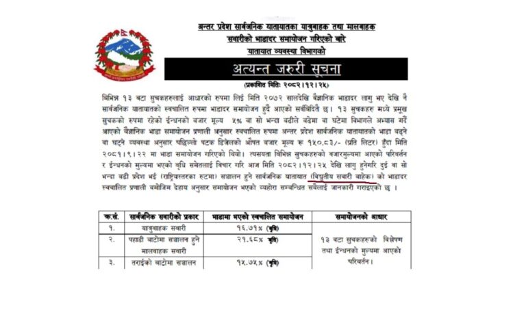 यात्रुवाहकमा १६.७१, पहाडी बाटोमा सञ्चालन हुने मालवाहकमा २१.६८ र तराई मालबाहकमा १५.७५ प्रतिशतले भाडा वृद्धि भएको हो ।