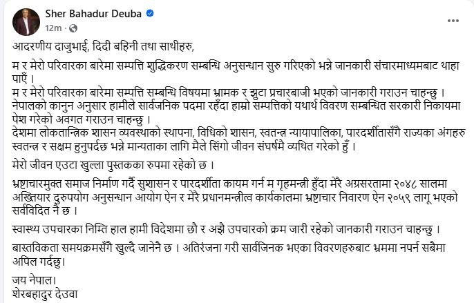 देउवाले सार्वजनिक पदमा रहँदा आफूहरूले कानुनअनुसार सम्पत्तिको यथार्थ विवरण सम्बन्धित सरकारी निकायमा पेस गरेको पनि स्पष्ट पारेका छन्। उनले लोकतान्त्रिक शासन, विधिको शासन, स्वतन्त्र न्यायपालिका र पारदर्शिताप्रति आफू जीवनभर प्रतिबद्ध रहेको बताएका छन्।