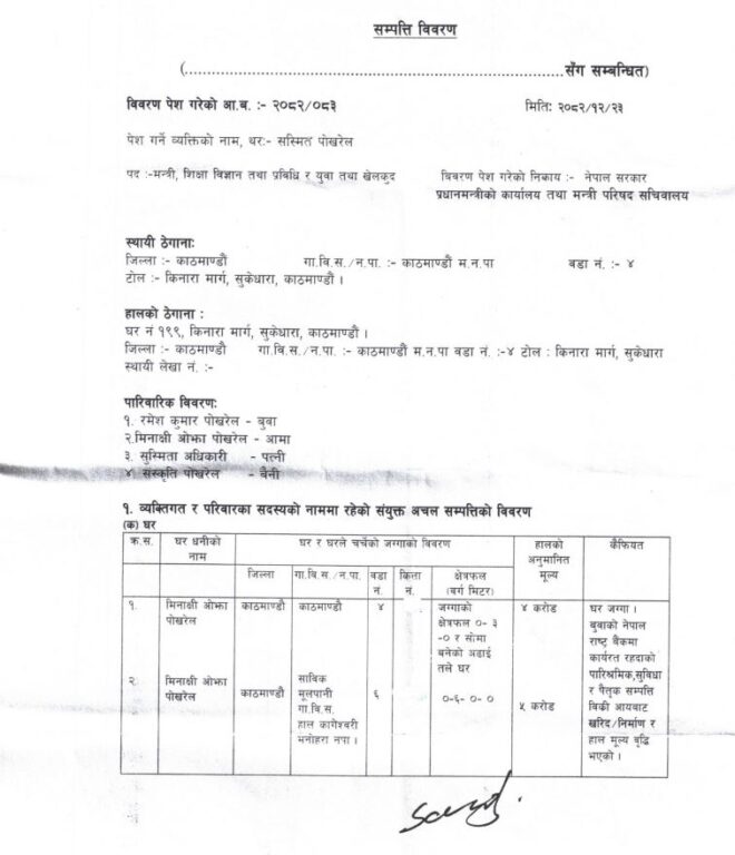 शिक्षा, विज्ञान तथा प्रविधिमन्त्री सस्मित पोखरेलले २३ करोड ४१ लाख २७ हजार खुद सम्पत्ति रहेको विवरण बुझाएका छन् ।