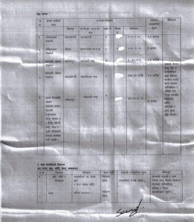 २५ तोला सुन र एक सय तोला चाँदी रहेको पनि उल्लेख छ । सानिमा र एनआईसी एसिया बैंकमा साढे चार लाख नगद रहेको उल्लेख छ । विभिन्न कम्पनीका सेयर र दुईवटा गाडी रहेको पनि विवरणम उल्लेख छ ।