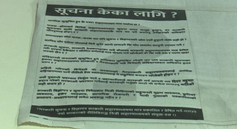 साेमबार प्रकाशित भएका सबैजसो निजी पत्रिकाहरुले पहिलो पृष्ठमा सूचना केका लागि भन्दै प्रश्नवाचक चिन्ह मात्रै छापेका हुन् । निजी सञ्चारमाध्यमलाई सरकारी सूचना र विज्ञापन छाप्न नदिने नयाँ सरकारको नीतिले नागरिकको संविधान प्रदत्त अधिकार हनन् हुने उनीहरुको तर्क छ। नागरिक सुसूचित हुन के एउटा मात्रै सञ्चारमाध्यम पर्याप्त छ भन्दै निजी सञ्चारमाध्यमले बालेन्द्र शाह नेतृवकाे सरकारलाई गम्भीर प्रश्न तेर्स्याएका छन् ।