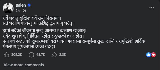 ‘सर्वे भवन्तु सुखिनः सर्वे सन्तु निरामयाः। सर्वे भद्राणि पश्यन्तु, मा कश्चिद् दुःखभाग् भवेत्॥ हामी सबैको जीवनमा सुख, आरोग्य र कल्याण छाओस्। सदैव शुभ होस्, निर्विघ्नता रहोस् र दुःखको हरण होस्। नयाँ वर्ष २०८३ को शुभारम्भको यस पावन अवसरमा सम्पूर्णमा सुख, शान्ति र समृद्धिको हार्दिक मंगलमय शुभकामना व्यक्त गर्दछु।’