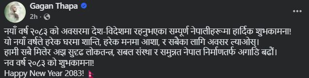 सभापति थापाले नयाँ वर्षले सबै नेपालीबीच आपसी एकता, भाइचारा, सद्भाव र सहकार्यलाई अझ सुदृढ बनाउँदै सङ्घीय लोकतान्त्रिक गणतन्त्रलाई संस्थागत रूपमा मजबुत बनाओस् भनी कामना गर्नुभयाे ।