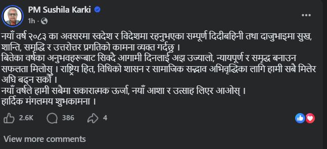 काठमाडौं । निवर्तमान प्रधानमन्त्री सुशीला कार्कीले मंगलबार नयाँ वर्ष २०८३ को अवसरमा स्वदेश र विदेशमा रहेका सम्पूर्ण दिदी-बहिनी तथा दाजु-भाइमा सुख, शान्ति, समृद्धि र उत्तरोत्तर प्रगतिको कामना गर्नुभएकाे छ।