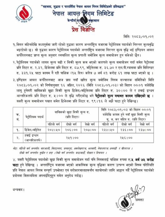 निगमले बुधबार राति एक विज्ञप्ति जारी गर्दै पेट्रोल र खाना पकाउने एलपी ग्यासको मूल्य भने यथावत् रहेकाे जनाएकाे हाे। डिजेल-मट्टितेलको प्रतिलिटर ३० रुपैयाँ र हवाई इन्धन आन्तरिकतर्फ प्रतिलिटर ५ रुपैयाँ मूल्य बढेको छ । अब डिजेल र मट्टीतेलको मूल्य पहिलो वर्गमा प्रतिलिटर २ सय ३४ रुपैयाँ ५० पैसा, दोस्रो वर्गमा २ सय ३६ रुपैयाँ र तेस्रो वर्गमा २ सय ३७ रुपैयाँ पुगेको हाे।