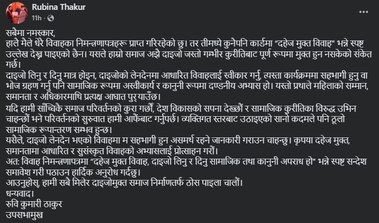 उहाँले बुधबार राति सामाजिक संजालमार्फत यस्ताे घोषणा गर्नुभएकाे हाे । समाजमा अझै पनि दाइजो प्रथा गम्भीर कुरीतिका रूपमा कायम रहेको बताउदै उहाँले यस्तो अभ्यासलाई सामाजिक र कानूनी रूपमा दण्डनीय अपराधका रूपमा व्याख्या गर्नुभएकाे छ । हालैका दिनमा आफूले प्राप्त गरेका विवाहका निमन्त्रणापत्रहरूमा ‘दहेजमुक्त विवाह’ भन्ने उल्लेख नभएको पाइएपछि उपसभामुख ठाकुरले सामाजिक सञ्जालमार्फत आफ्नो धारणा सार्वजनिक गर्नुभएकाे हाे ।