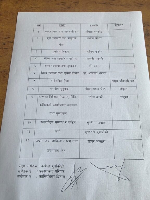बिहीबार मध्याह्न सिंहदरबारस्थित संसदीय दलको कार्यालयमा बसेको बैठकले प्रतिनिधिसभा अन्तर्गतका विषयगत समितिहरूका लागि उम्मेदवार तय गरेको हो । पार्टीका एक सांसदका अनुसार प्रस्तावित नामहरू बैठकबाट अनुमोदनसमेत गरिएको छ ।