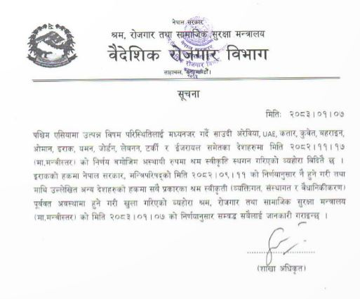 वैदेशिक रोजगार विभागले साेमबार एक सूचना जारी गर्दै साउदी अरब, युएई, कतार, कुवेत, बहराइन, ओमान, इराक, यमन, जोर्डन, लेबनान, टर्की र इजरायलमा श्रम स्वीकृति खुला गर्ने निर्णय भएको हो । श्रम, रोजगार तथा सामाजिक सुरक्षा मन्त्रालयमा साेमबार बसेको मन्त्रिस्तरीय बैठकले गत फागुन १७ गतेदेखि अस्थायी रूपमा श्रम स्वीकृति स्थगन गरिएका देशमा श्रम स्वीकृति खुला गर्ने निर्णय गरेको हो ।