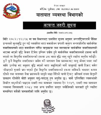 विभागले मंगलबार राति एक सूचना जारी गर्दै इन्धनको मूल्य बढेपछि हालै गरिएको भाडा समायोजन डिजेल इन्जिन भएका गाडीहरूमा मात्र लागू हुने जनाएको हो । अन्तर्राष्ट्रिय बजारमा पेट्रोलियम पदार्थको मूल्यवृद्धि भएपछि विभागले गत चैत २५ गते स्वचालित भाडा समायोजन प्रणालीअनुसार अन्तरप्रदेश सार्वजनिक यातायातको भाडा बढाएको थियो ।
