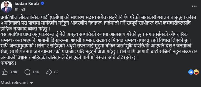 नेता किरातीले बुधबार सामाजिक सञ्जाल फेसबुकमार्फत प्रलोपासँगको करिब ५ महिना लामो यात्रा टुङ्ग्याएको घोषणा गर्नुभएकाे हाे । उहाँले यस यात्रामा मार्गदर्शन गर्ने नेताहरू, हातेमालो गर्ने सम्पूर्ण साथीहरू तथा कर्मचारीहरूप्रति धन्यवाद व्यक्त गर्नुभएकाे छ। पार्टीमा बिताएको ५ महिनाको अनुभवलाई अमूल्य सम्पत्तिको रूपमा आत्मसाथ गरेको उल्लेख गरेका छन् । नेता किरातीले संगठनसँगको औपचारिक सम्बन्ध अन्त्य भएपनि आगामी दिनहरूमा आपसी सम्मान, सद्भाव र मित्रवत सम्बन्ध यथावत् रहने समेत बताउनुभयाे ।