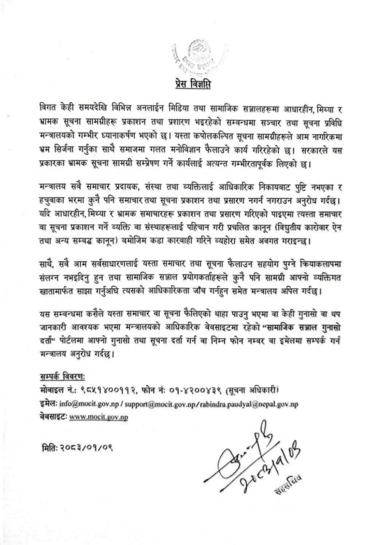 पछिल्लो समय विभिन्न सञ्चार माध्यम-सामाजिक सञ्जालमा आधिकारिकता पुष्टि नभएका सूचनाहरू प्रवाह भइरहेको भन्दै मन्त्रालयले यस्ता सामग्रीले आम नागरिकमा अनावश्यक भ्रम सिर्जना गरेको, समाजमा नकारात्मक तथा गलत मनोविज्ञान फैलाएको र हचुवाका भरमा सूचना प्रवाह गरी सामाजिक सद्भावमा आँच पुर्याएको जारी विज्ञप्तिमा उल्लेख गरेको छ ।