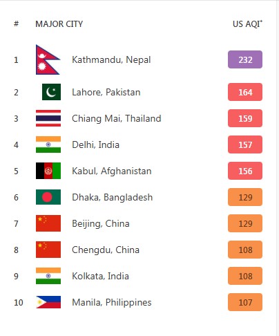 काठमाडाैं विश्वका ठूला शहरमध्ये वायु प्रदूषण उच्च रहेका सहरहरूको सूचीको पहिलो नम्बरमा पुगेको छ । उपत्यकासहित देशका सबैजसो ठाउँमा वायु प्रदूषण बढेको हाे । वातावरण विभागले सञ्चालन गरेका सबै मापन केन्द्रहरूले रातो रङ्गको चेतावनी दिइरहेका छन् । एक्युआई १ सय ५० भन्दा माथि पुगेपछि मापन केन्द्रहरूले रातो सङ्केत गर्छन् ।