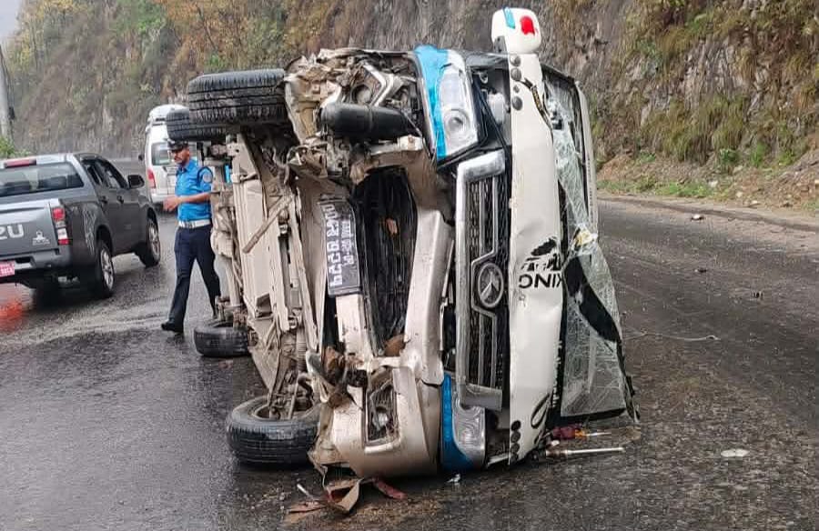 काठमाडौँ बाट पोखरा जाँदै गरेको बा -प्रदेश -०१- ००६ – ख – ७२२१नम्बरको माइक्रोबस पृथ्वी राजमार्ग अन्तर्गत धादिङको आदम घाट नजिकै सडकमा नै पल्टिएको हो ।
