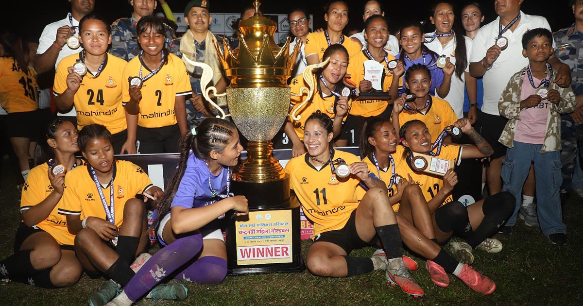 झापाकाे मेची रङ्गशालामा मंगलबार सम्पन्न खेलमा एपीएफले फाइनलमा त्रिभुवन आर्मी क्लबलाई १–० गोल अन्तरले पराजित गर्दै उपाधि जितेको हो । उपाधिसँगै एपीएफले नगद ११ लाख रुपैयाँ पुरस्कार, ट्रफी, मेडल तथा प्रमाणपत्र प्राप्त गरेको छ। उपविजेता आर्मीले भने पाँच लाख रुपैयाँ नगद पुरस्कारमा चित्त बुझाएको हाे । एपीएफको जितमा निर्णायक गोल रश्मीकुमारी घिसिङले गरेकी हुन् । खेलको ७२औँ मिनेटमा कप्तान अनिता बस्नेतले दिएको पासलाई घिसिङले हेडमार्फत जाली चुमाएकी थिइन् ।