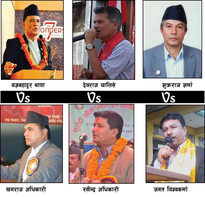 थापा दोस्रो संविधानसभा चुनाव २०७० मा काँग्रेसकी उम्मेदवार शारदा पौडेलसँग पराजित भएका थिए । गुरुङ र पहारी चाहीं पहिलो पटक सांसद चुनाव लड्न लागेका हुन् ।