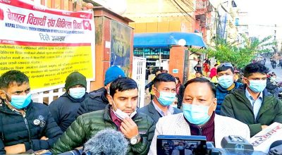 काठमाडौं । अतिरिक्त शुल्क उठाएर ठगी गरेको विरोधमा उत्रिएका एमबिबिएसका विद्यार्थीलाई सिनामंगलस्थित काठमाडौं मेडिकल कलेज (केएमसी)का प्रिन्सिपल रतिचन्द्र श्रेष्ठले शिक्षमन्त्री देवेन्द्र पौडेलकै अगाडि हपारेका छन् । बिहीबार अनुगमनका लागि कलेज पुगेका
