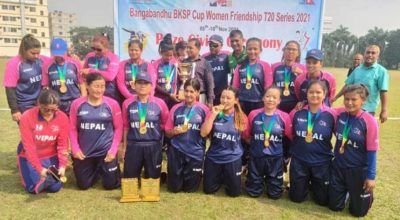 काठमाडौं । नेपालको राष्ट्रिय महिला क्रिकेट टिमले बंगलादेशमा भएको बंगबन्धु बीकेएसपी कप वुमन फ्रेन्डसिप ट्वेन्टी ट्वेन्टी श्रृंखला जितेको छ । बुधबार बंगलादेशको बीकेएसपीको टिमलाई ७ विकेटले पराजित गर्दै नेपालले तीन