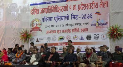 इलाम, माघ २४ । दलित जनप्रतिनिधिको प्रदेश नम्बर १ स्तरीय भेला तथा ‘दक्षिण एसियाली दलित मिट–२०७६’ शुक्रबारबाट इलाममा सुरु भएको छ । दुई दिनसम्म चल्ने भेलामा दलित समुदायका संघिय सांसद्, प्रदेश